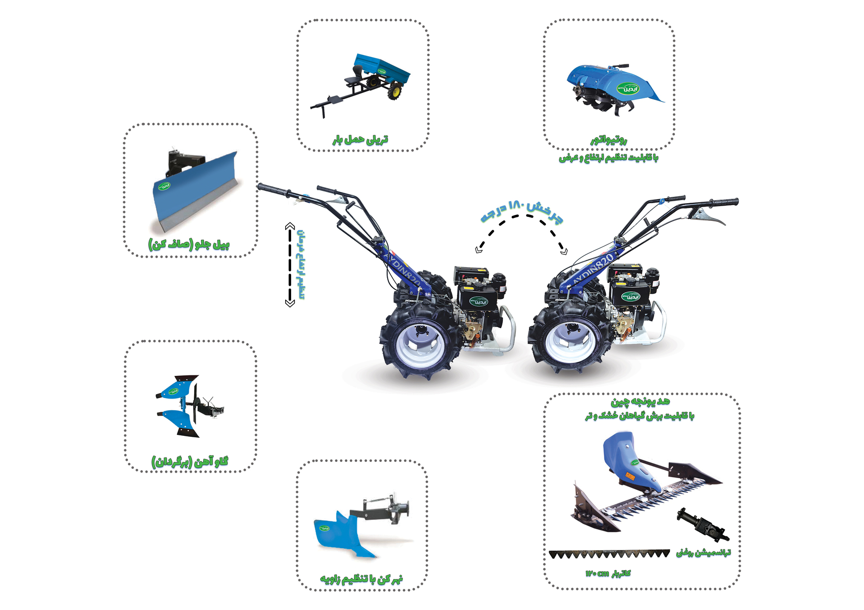محصولی از شرکت ماشین سازی آیدین تراکتور با قابلیت نصب انواع ادوات باغی، چرخش 180 درجه فرمان، تنظیم ارتفاع فرمان و لرزشگیر فرمان